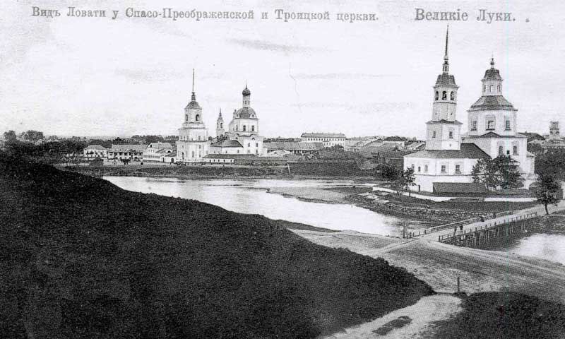 Вид на город с крепостного вала. Волоцкий мост, Спасо-Преображенская церковь на о. Дятлинка и Торговая площадь с Троицкой церковью.