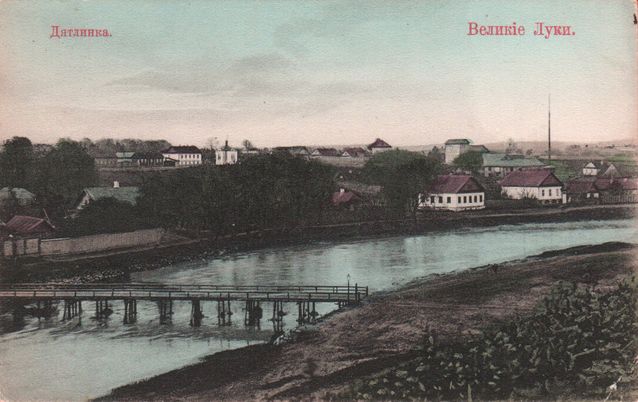 До революции на нём было до 50 домов. На переднем плане - Волоцкий мост, соединявший дорогу на левом берегу Ловати с небольшой площадью на острове у Спасо-Преображен-ской церкви. На заднем плане видна Екатерининская часовня на одноимённой улице (ныне ул. Пушкина). Часовня восстановлена в 2001 году. Б правом углу виден пивоваренный завод О.П.Эльстинга, построенный в 1896 году (сохранились развалины его стен). Снято с крепостного вала.