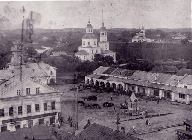 Вид на Спасо-Преображенскую церковь и Воскресенский собор в крепости с колокольни Вознесенской церкви.