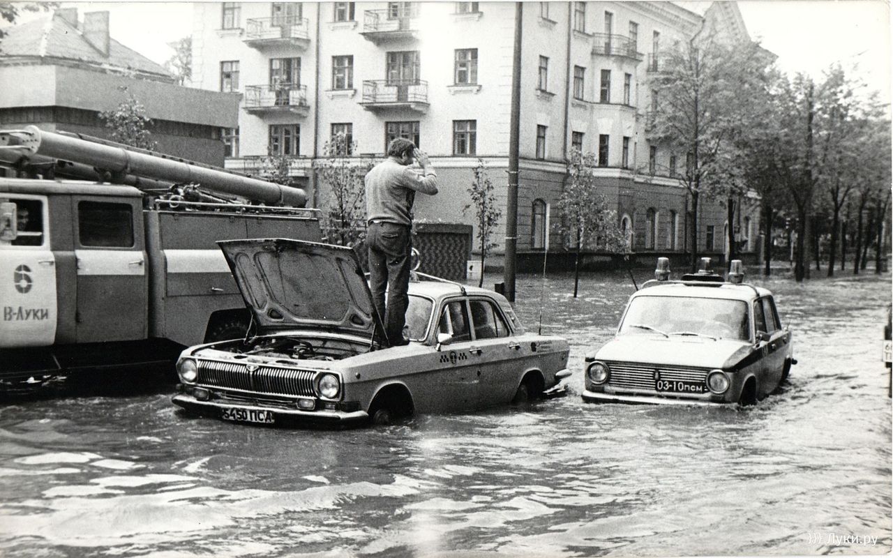 6-10 августа 1987 году в Великих Луках прошел сильнейший ураган и ливень. Это вызвало затопление многих улиц.