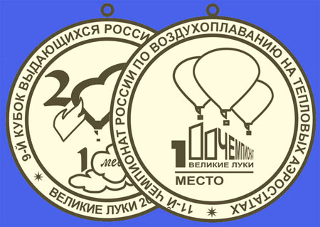 По эскизам, разработанным главным дизайнером Встреч воздухоплавателей в Великих Луках Валерием Медведевым, будут изготовлены три комплекта наград для победителей соревнований по воздухоплаванию, которые пройдут в нашем городе в начале июня. Планируется разместить заказ на изготовление медалей для 11-го Чемпионата России по воздухоплаванию на тепловых аэростатах, 9-го розыгрыша Кубка выдающихся российских аэронавтов и 1-го розыгрыша Кубка Великих Лук по воздухоплаванию. Как рассказал автор всех эскизов Валерий Медведев, традиционно на медалях будут изображены официальные эмблемы соревнований (которые меняются ежегодно), городская и воздухоплавательная символика. На обороте же медалей будет изображена эмблема всех великолукских Встреч, утвержденная впервые в 1998 г.