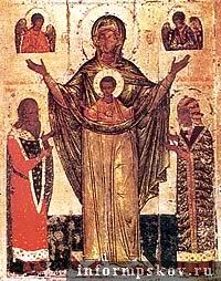 Оранта – в переводе с латинского «Молящаяся». Богородица на иконе изображается во весь рост с молитвенно поднятыми вверх руками, выражающими ее заступничество перед Царем Небесным о всем роде человеческом. На груди у Богородицы изображение золотого диска с Богомладенцем – такое изображение в византийских иконах называлось «Великая Панагия» – Всесвятая, а в Русской Церкви - «Знамение», что понятийно соотносится с чудом.