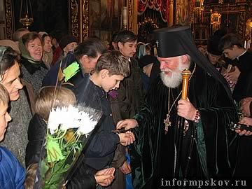 16 октября в Свято-Троицком Кафедральном Соборе после Божественной Литургии, которая совершалась Архиерейским служением, был отслужен молебен священномученику Евсевию (III в. с греч. - благочестивый). На молебне присутствовало духовенство Псковской епархии: благочинные округов, отцы Наместники обителей, настоятели храмов, игуменьи и насельницы псковских монастырей. Их присутствие было вызвано большим событием в жизни Епархии: 40 –летие священнической деятельности Архиепископа Псковского и Великолукского Евсевия, и празднование дня Ангела Владыки, которое по объективным причинам было перенесено с 17 октября на воскресение. Троицкий Собор в этот день был заполнен прихожанами и гостями. Владыке пожелали «во всем благого поспешения» и пропели Многая лета. Отец Наместник Псково – Печерского монастыря Архимандрит Тихон преподнес в дар Владыке икону Божией Матери Одигитрия. Было много подарков и цветов от любящих Владыку православных.