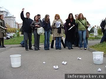 По словам координатора движения Андрея Лукина, «Первый рубеж» решил «ударить символизмом по фашизму». Символичность акции заключалась в проведении «антифашистского баскетбола». Около 30 студентов на глазах у журналистов и любопытствующих граждан комкали листы бумаги со знаком свастики и бросали их в мусорные корзины, соревнуясь в меткости. «Это очень весело», - поделился с корреспондентом ПАИ один из участников акции.