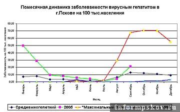 За 9 месяцев текущего года диагноз «гепатит А» был поставлен 458 жителям Псковской области. Как сообщил корреспонденту ПАИ главный врач ФГУЗ «Центр гигиены и эпидемиологии в Псковской области» Сергей Никифоров, за аналогичный период 2004 года гепатитом А заболели 265 человек. Таким образом, заболеваемость гепатитом А в области выросла на 73,2%.