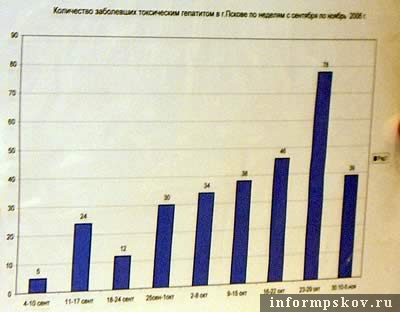 "Улучшение ситуации по отравлению нелегальным алкоголем не наблюдается", - заявил 2 ноября вице-губернатор Псковской области Юрий Демьяненко на пресс-конференции, посвященной вопросу массового отравления в регионе. Он представил журналистам график по количеству заболевших токсическим гепатитом с момента начала эпидемии и сказал, что больше всего отравившихся зафиксировано на прошлой неделе, с 23 по 28 октября. "Мы опасаемся, что за эту неделю число пострадавших от нелегального спирта достигнет критической точки", - предположил вице-губернатор. В течение трех дней количество людей, обратившихся в лечебные учреждения области, увеличивалось следующим образом: 31 октября к медицинской помощи прибегли 15 человек, 1 ноября – 10 и 2 ноября - 29 псковичей.