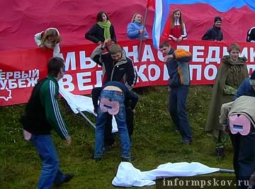 16 ноября в Печорском районе Псковской области на российско-эстонской границе (таможенный пропускной пункт Куничина Гора) активисты движения "Первый Рубеж" провели акцию в знак протеста против обсуждения в эстонском парламенте инициативы о сносе памятников советским солдатам-освободителям. Как сообщил корреспонденту ПАИ председатель совета Псковского регионального молодежного движения "Первый Рубеж", в ходе театрализованного представления "эстонцы" с лицами, раскрашенными в цвета эстонского флага, с тараном нападали на импровизированный памятник советскому воину. На защиту памятника встали "перворубежцы", "выпоровшие" ремнями "эстонцев" за попытку разрушить памятник.