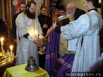 8 февраля в псковском храме св. Василия Великого Архиепископ Псковский и Великолукский Евсевий освятил 9 новых колоколов. Как сообщили ПАИ в информационной службе Псковской епархии, на самом большом колоколе, весом 530 килограммов, отлиты иконы св. Василия Великого, апостола Андрея, святителя Николая и страстотерпца Бориса.