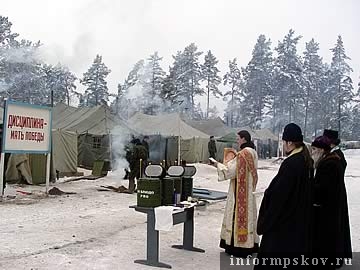 Духовенство совершило водосвятный молебен, и молебен, в котором испрашивали благословение Господа на ратные труды, предстательства Богородицы, здравия военным. Прошлым летом священники так же, как и сейчас, среди сосен и палаток пели молитву - благословение: "Крепость людям своим даст Господь. Господь благословит люди своя миром". Чин освящения проводился по канонам военных треб: отец Олег кропил святой водой палатки, в которых размещается рядовой и офицерский состав соединения, отец Димитрий Ульянов освящал по "чину освящения колесницы" боевую технику, отец Димитрий Самарцев – оружие и хозяйственную часть с полевыми кухнями. Такое освящение территории военного лагеря, техники, оружия, палаток и т.д. дает нашим воинам невидимую духовную силу, Сам Господь будет хранить наше российское воинство.