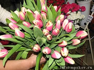 Псковские мужчины предпочитают дарить своим женщинам на 8 марта тюльпаны. Как сообщили корреспонденту ПАИ в одном из цветочных магазинов города, средняя цена букета из весенних цветов составит около 140 рублей. Также в павильоне отметили, что для поздравления женщин в коллективах мужчины закупают много гвоздик.