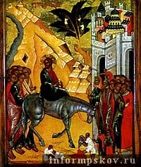 Вход Господень в Иерусалим день, когда разнеслась весть о воскрешении Лазаря по всей Иудее. В Иерусалим стекались толпы народа на праздник Пасхи для закалания жертвенного агнца, и Иисуса ждали с ветвями пальмы символом жизни и цветения в Палестине, встречали как величайшего пророка, как Мессию. И когда Господь вступал в Иерусалим, толпы кричали: «Осанна в Вышних! Осанна Сыну Давидову! Благословен Грядый во Имя Господне!»