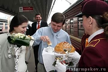 У жителей Псковской области есть возможность пожениться и отпраздновать свою свадьбу в поезде. Об этом корреспонденту ПАИ сообщили в службе по связям с общественностью Октябрьской железной дороги (ОЖД)- филиала ОАО «Российские железные дороги» (РЖД). В службе отметили, что «Свадебный поезд» это совместный проект компании ООО «РЖД ТУР» и ОЖД. Из подвижного состава, предоставляемого Октябрьской магистралью, формируется свадебный поезд, а «РЖД ТУР» организует программу тура.