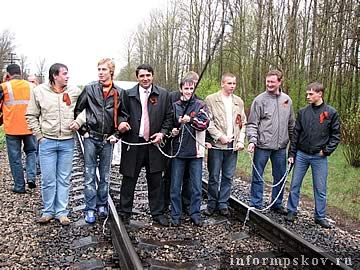 Участники, приковав себя к рельсам цепями и наручниками, под Знаменем Победы и фотографией памятника Воину-Освободителю остановили грузовой поезд, который следовал из Москвы в Таллин. Железнодорожный переезд был перекрыт несколько минут. Затем, участники акции принесли свои извинения машинисту, и повязали Георгиевские ленточки на состав.