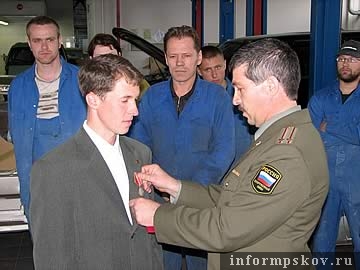 14 мая в Пскове младшему сержанту запаса, специалисту кузовных работ Союза автотранспортных предприятий «Авто-Альянс» Роману Головневу вручили медаль Суворова «За мужество и героизм», проявленный во время проведения антитеррористических операций в республике Чечне. Как передает корреспондент ПАИ, награду вручили представители военкомата Пскова и Псковской области.