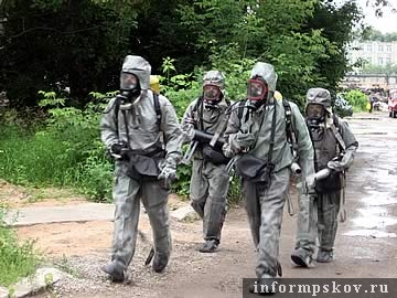 В 10.04 прозвучал сигнал тревоги. На предприятие прибыли подразделения пожарной службы (части № 2 и № 3 Пскова). В костюмах индивидуальной химической защиты Л 1 и они добрались до места распространения опасного вещества. Там они установили два щелевых распылителя для разбрызгивания воды, чтобы получить две мощных струи. Один из рукавов пробило, и образовалась лишняя струя воды, которая залила крышу соседнего сарая.