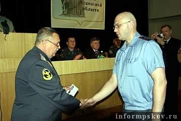 Н. Овчинников вручил медаль «За отличие в охране общественного порядка» майору милиции старшему оперуполномоченному группы по раскрытию краж чужого имущества Вячеславу Романову и старшему инспектору отдела УБОП при УВД по Псковской области Сергею Яковлеву.