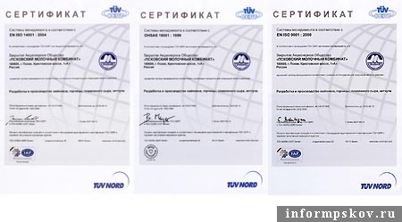 Псковский молочный комбинат первым в области получил международные сертификаты по экологии и профбезопасности