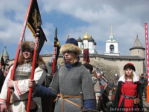 Участники "Ледового побоища" прошли по Пскову в боевых доспехах