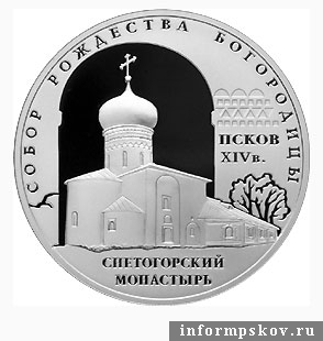 На фото: монета с изображением собора Рождества Богородицы Снетогорского монастыря.