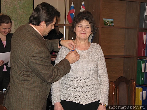 На фото: Владимир Жолудев награждает Нину Горшкову.