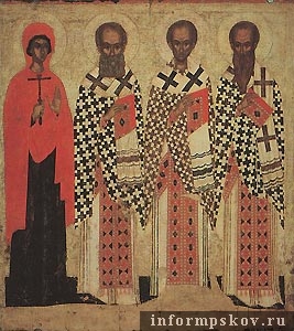 На фото: Псковская икона XIV в. Три Святителя со св. Параскевой.