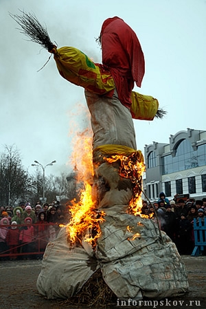 В Пскове первый день весны встретили под полыхающее чучело зимы
