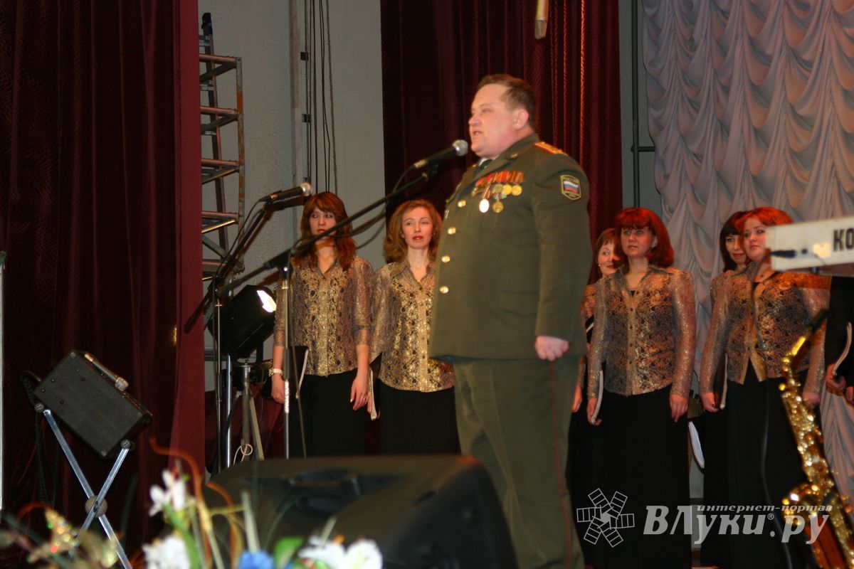 Буквально отшумел финал, как пора было собираться в ДМШ №1 им. М.П.Мусоргского. В 18.00 начинался концерт с участием творческих коллективов города и, как гласила афиша, группы «Голубые молнии». Зал на 400 мест был полным. Вечер начал хор «Кант», как всегда сорвавший своим выступлением, шквал аплодисментов. Затем к микрофону вышел военный комиссар Великих Лук полковник Борис Диденко, сменил которого Городской хор ветеранов.