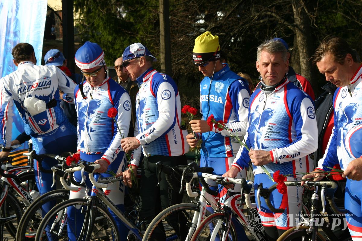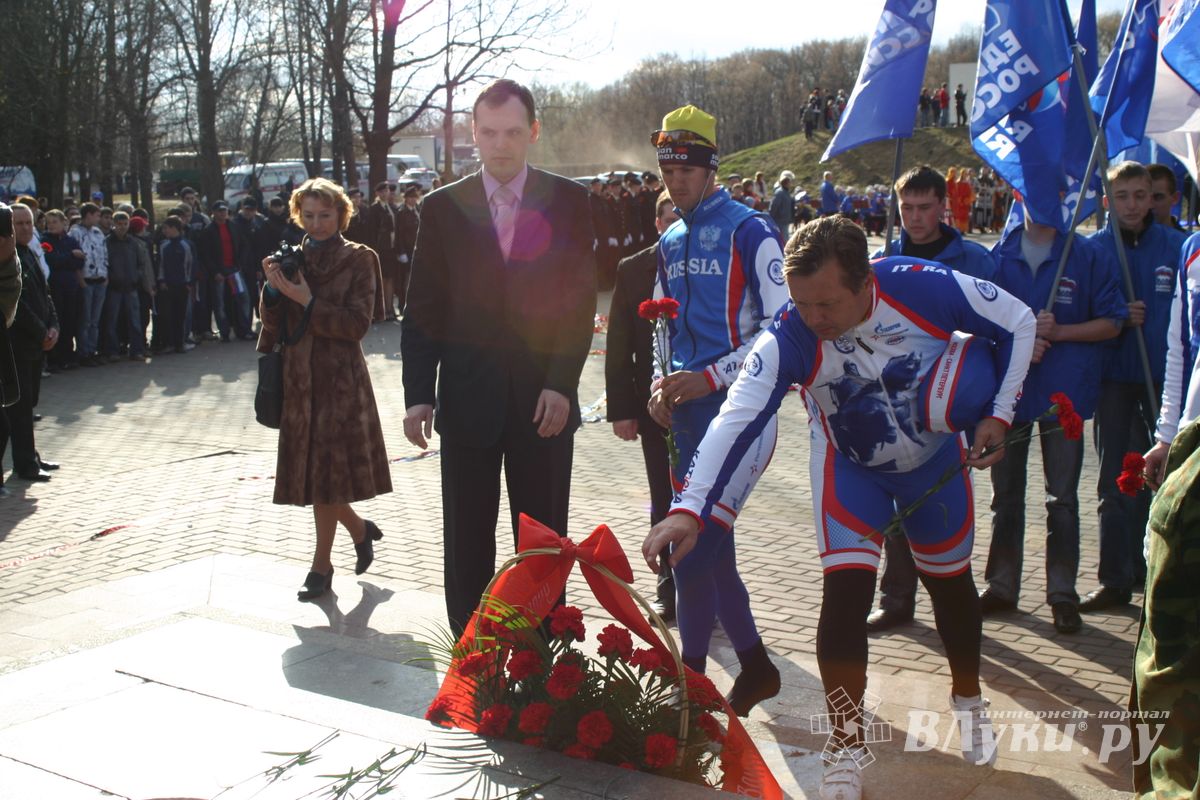 В торжественной обстановке участников велопробега приветствовали председатель Государственного областного комитета по молодежной политике и спорту А. Петров, руководители Администрации города и воспитанники детско-спортивных школ, представители кадетской школы и руководители городской Администрации. К собравшимся обратились и именитые спортсмены: А.Гусятников — руководитель пробега (ЗМС) и О.Соколова — 2-кратная чемпионка мира. После этого представители городской Администрации и Олимпийские чемпионы А.Яркин и В.Осокин возложили памятные венки к «Вечному огню».
