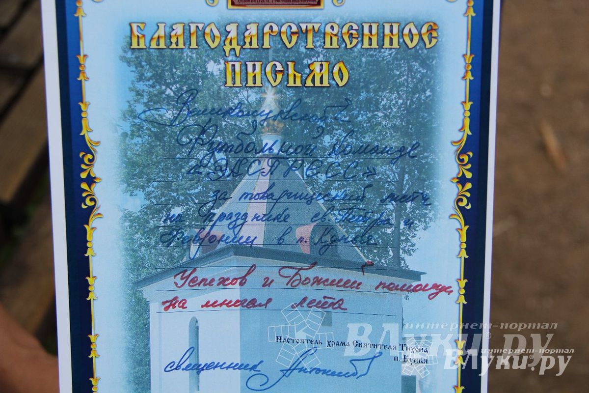 Затем на футбольном поле местная команда «Стрела» и «Экспресс» из Великих Лук сыграли товарищеский матч. Встреча закончилась в пользу гостей 2:1. По завершении матча настоятель храма отец Антоний пожелал быть юным футболистам такими же твердыми в своём стремлении заниматься спортом, какими были Пётр и Февронья в своих убеждениях. Отец Антоний также подарил командам по футбольному мячу и вручил благодарственные письма.