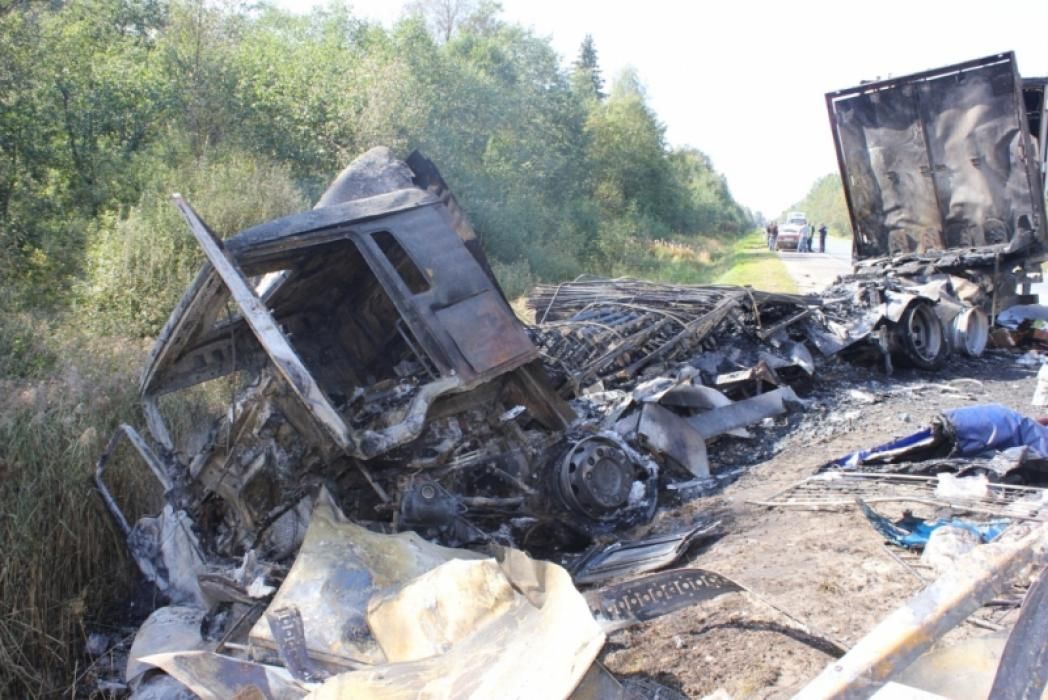 Напомним, авария произошла неподалёку от деревни Цапелька. В результате столкновения легковой автомобиль отбросило в кювет, туда же частично съехала фура: оба транспортных средства после столкновения загорелись.