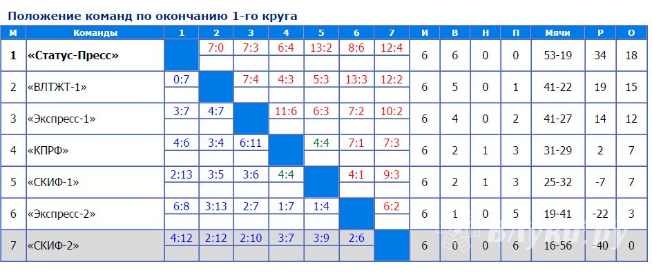 - в I лигу входят команды: «Статус-Пресс», «ВЛТЖТ-1», «Экспресс-1», «КПРФ», «СКИФ-1», «Экспресс-2», «СКИФ-2»;