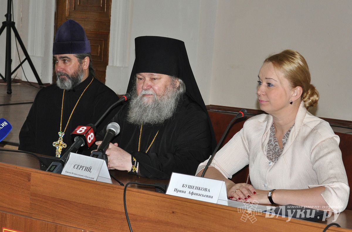 Правящий архиерей Великолукской епархии владыка Сергий встретился с представителями СМИ. Участие в мероприятии также приняли заместитель главы администрации города И. А. Бушенкова и епархиальный секретарь о. Иоанн (Ильницкий).