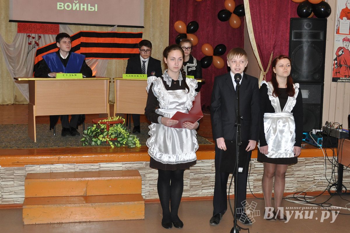 Открытый урок истории в рамках проекта «Связь поколений» прошел сегодня, 27 февраля, в педагогическом лицее г. Великие Луки. Директор лицея, депутат великолукской городской думы Ю. А. Ярышкина, подошла к проекту творчески: вместо обычного урока учащиеся, их родители и гости стали участниками суда над фашизмом.