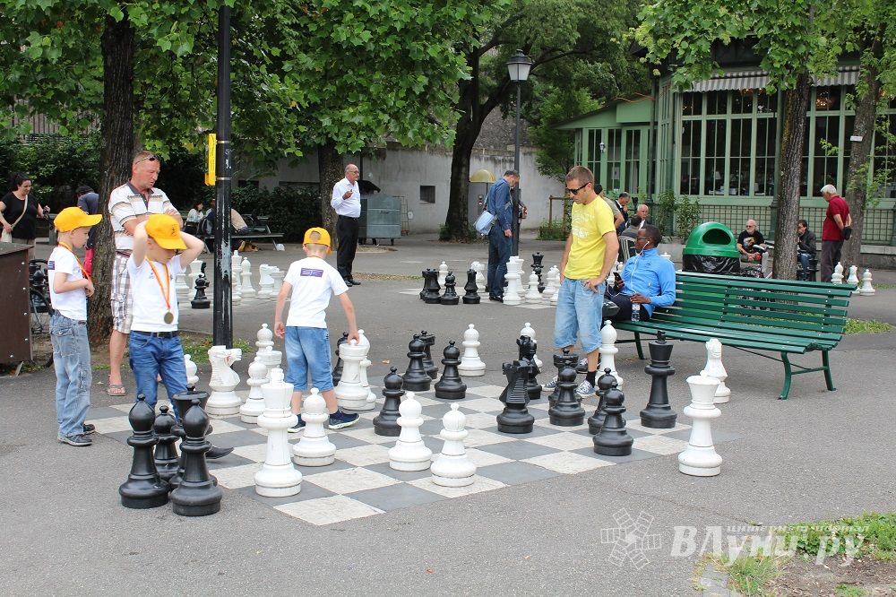 Вечером шахматная жизнь наших юных талантов не закончилась. Прогуливаясь по прекрасному женевском парку, в жаркий солнечный день, ребята подошли на площадку, где были установлены на асфальте несколько шахматных досок с большими фигурами, почти совпадающие с их ростом. За увлекательной игрой ребят между собой сначала наблюдали и уже взрослые женевские поклонники шахмат, которые проводили свой досуг в этом парке. Потом наши ребята по просьбе женевцев сыграли и с ними несколько партий, заслужив похвалу и признание за красивую и интересную игру.