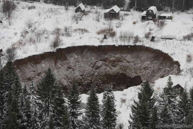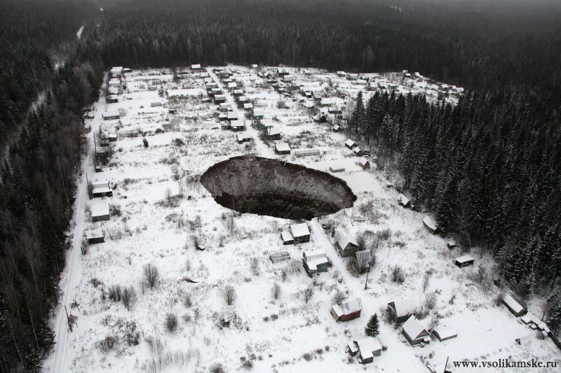 30 августа в сообществе «Соликамск» в «Одноклассниках» были опубликованы сделанные с вертолёта фотографии масштабного провала грунта под Соликамском в Пермском крае. На снимках видно, что за девять месяцев провал увеличился в несколько раз, заняв больше половины территории бывшего дачного кооператива «Ключики», пишет tjournal.ru.
