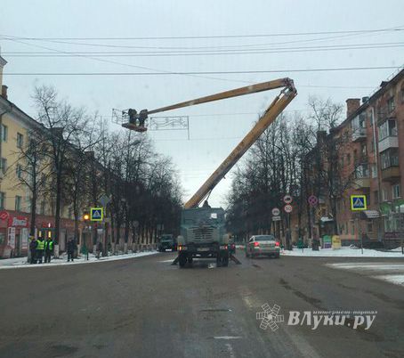 В Великих Луках на проспекте Ленина убирают уличные новогодние украшения. В связи с этим дорожное движение на данном участке затруднено.