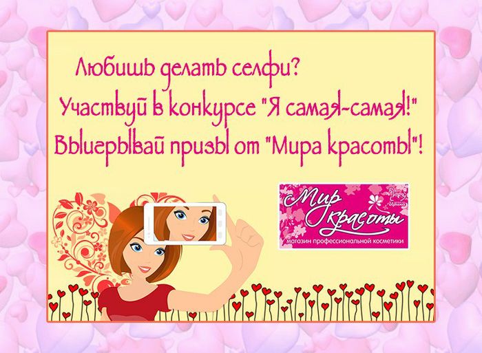 В преддверии самого яркого и романтического праздник весны 8 марта Интернет-портал ВЛуки.ру организовал конкурс на самое романтическое селфи «Я самая-самая!». Напомним: все, что нужно было для участия — загрузить в группу Интернет-портала ВЛуки.ру в vk самое романтическое селфи, собрать наибольшее количество лайков и получить приз от магазина профессиональной косметики «Мир красоты».