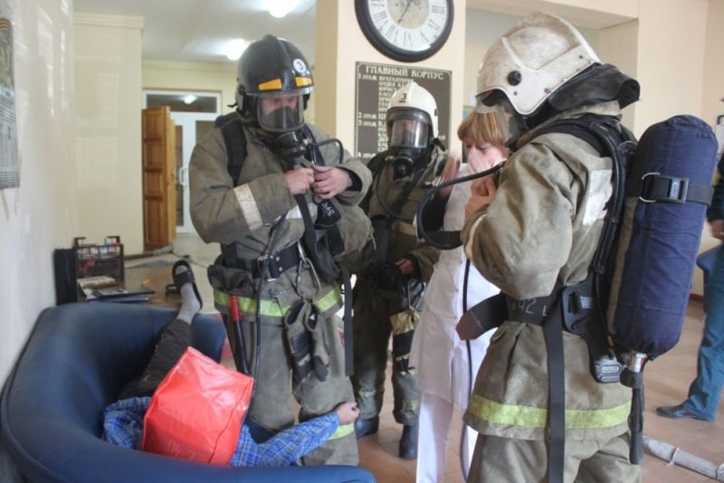 Так, на пульт дежурного поступило сообщение от персонала о том, что в результате короткого замыкания электропроводки на третьем этаже в рентген кабинете произошло условное возгорание. Продукты горения быстро заполнили помещения здания, где находились люди. Эвакуация людей была затруднена из-за сильного задымления в здании, через оконные и открытые дверные проемы пожар распространился в соседние помещения, несколько этажей находились в задымлении.