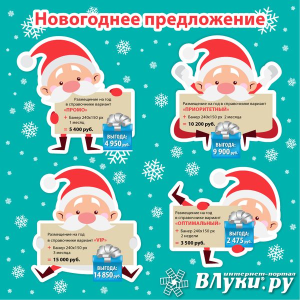 Новый 2017 год с каждым днем все ближе и ближе, и так просто за новогодними хлопотами позабыть о важности расширения рекламной кампании Вашего бизнеса! А меж тем, Интернет-портал ВЛуки.ру представляет «Новогоднее предложение»!