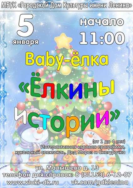 2 и 5 января в 11.00 - Интерактивный кукольный спектакль Baby - Ёлка «Ёлкины истории» для детей от 2-х до 4-х лет. А также игровая программа вокруг ёлки с Дедом Морозом и Снегурочкой.