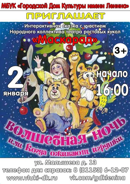 Интерактивный кукольный спектакль «Волшебная ночь, или когда оживают игрушки» , а также игровая программа вокруг Ёлки с Дедом Морозом и Снегурочкой.