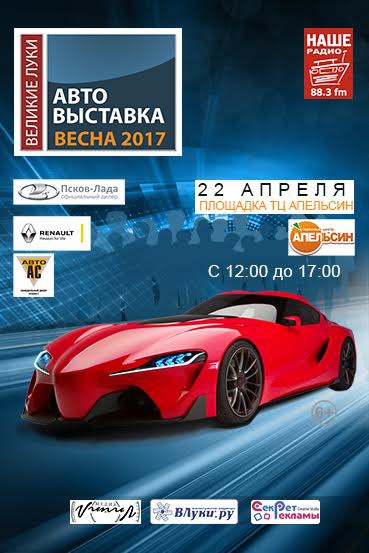 «Ежегодная автовыставка Весна 2017»в Великих Луках пройдет 22 апреля с 12:00 до 17:00 на площадке перед торговым центром «Апельсин» по адресу: г. Великие Луки, ул. Вокзальная, д. 11.