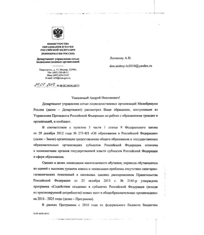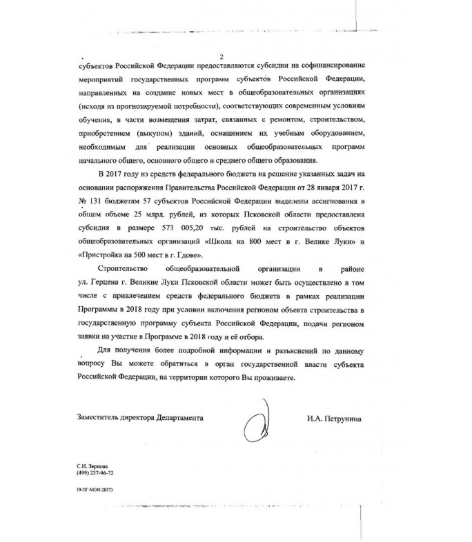 Основанием для моего письма, служит ответ (см. дополнительные материалы) Министерства образования РФ, касательно строительства новой школы именно для наших районов (Герцена, Щорса, Малышева и других) в городе Великие Луки. Именно благодаря нашим совместным усилиям, мы, все вместе, добились существующего положения вещей.