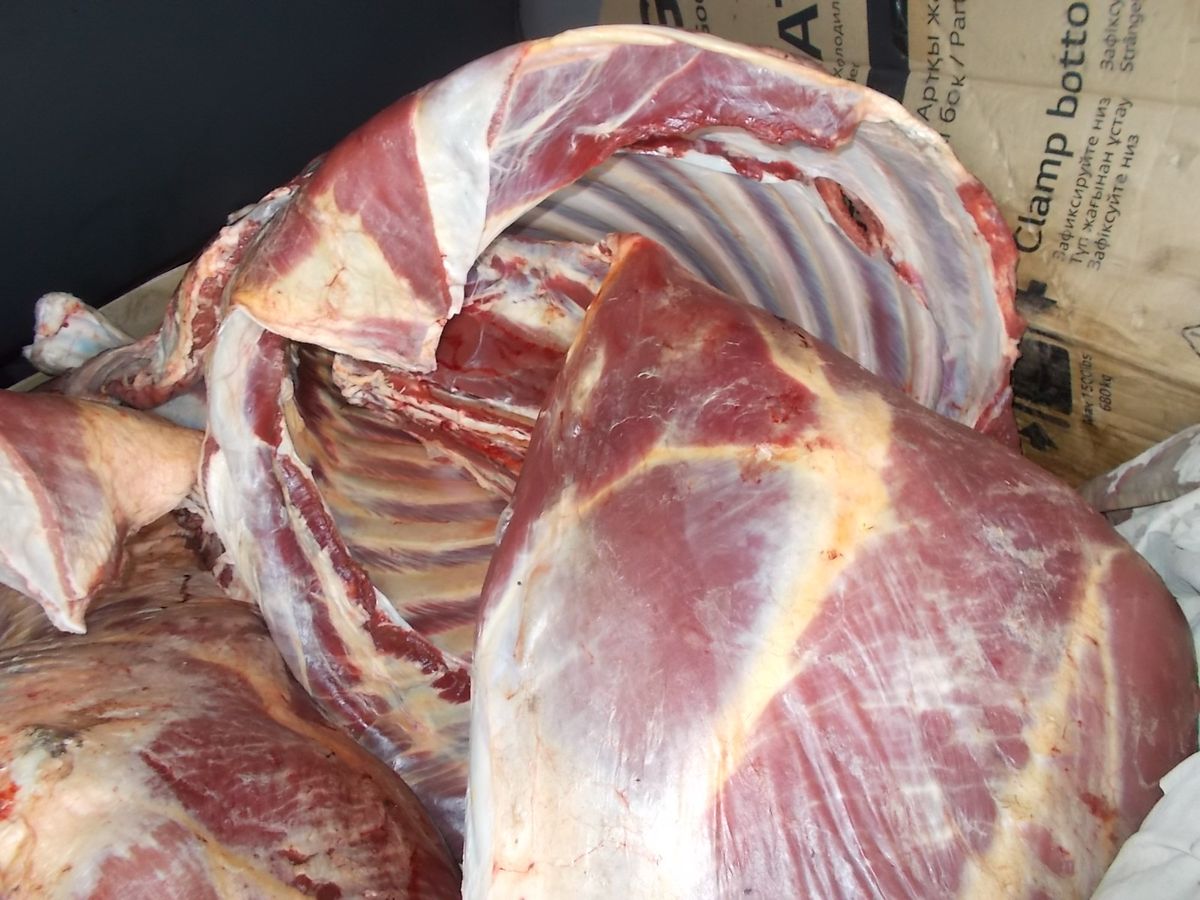 - две туши говядины (разделены на передние и задние части), тёмно-красного цвета, мясо уложено навалом, переложено картоном, накрыто загрязненной тканью;