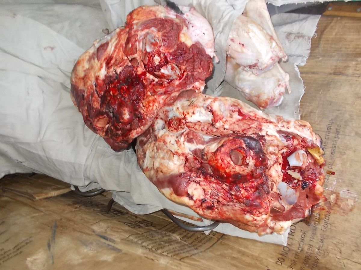 - головы говяжьи, частично со шкурой, без упаковки, уложены на картон, накрыты загрязненной тканью.
