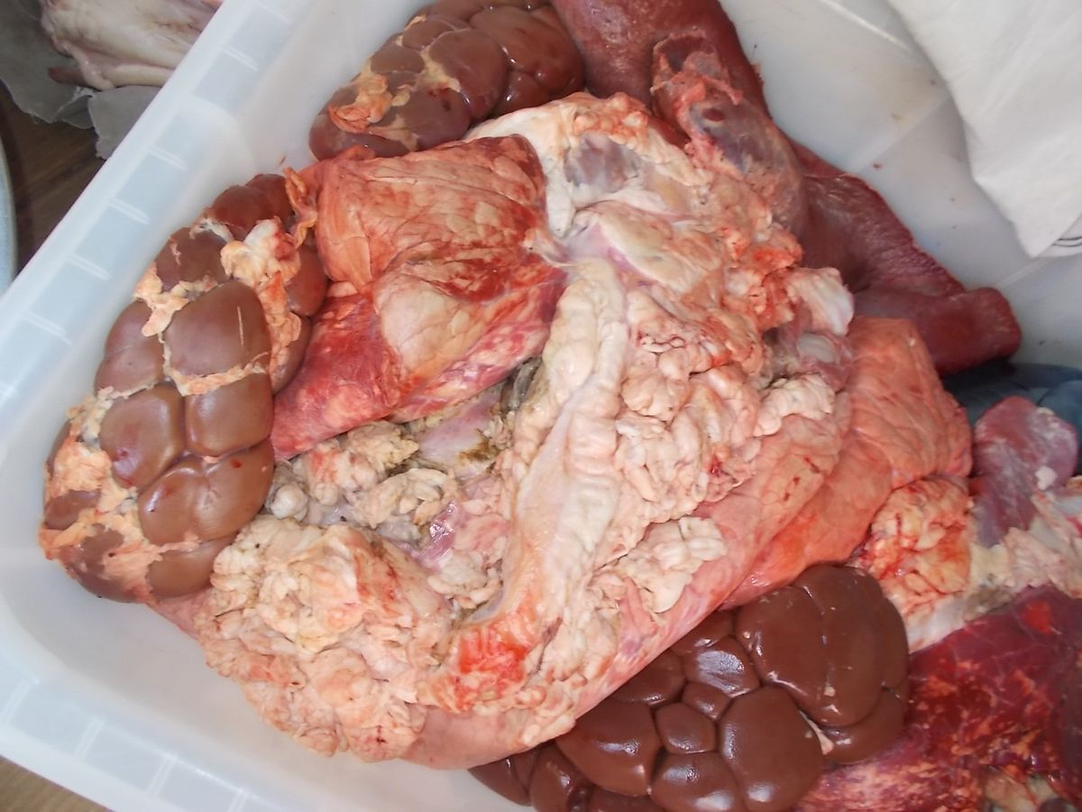 - субпродукты говяжьи (печень, легкое, селезенка, почки) уложены в пластиковый ящик;