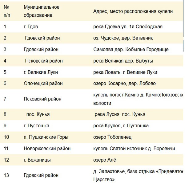 По официальным данным муниципальных образований, на территории области будут определены места для проведения крещенских купаний: