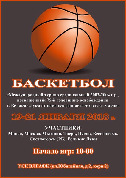 В Великих Луках в УСК ВЛГАФК с 19 по 21 января 2018 г. проходит Международный турнир по баскетболу среди юношей 2003-2004 гг.р. (6+). Турнир посвящён 75-й годовщине освобождения Великих Лук от немецко-фашистских захватчиков.