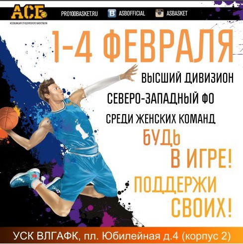 С 1 по 4 февраля в Великих Луках в УСК ВЛГАФК (пл. Юбилейная д. 4 корпус 2) пройдут матчи АСБ (Ассоциация Студенческого Баскетбола) среди женских команд в высшем дивизионе Северо-Западного федерального округа (6+).