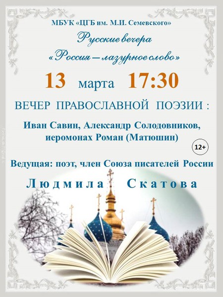 Вечер православной поэзии состоится в ЦГБ имени М.И. Семевского 13 марта в 17:30 (12+).